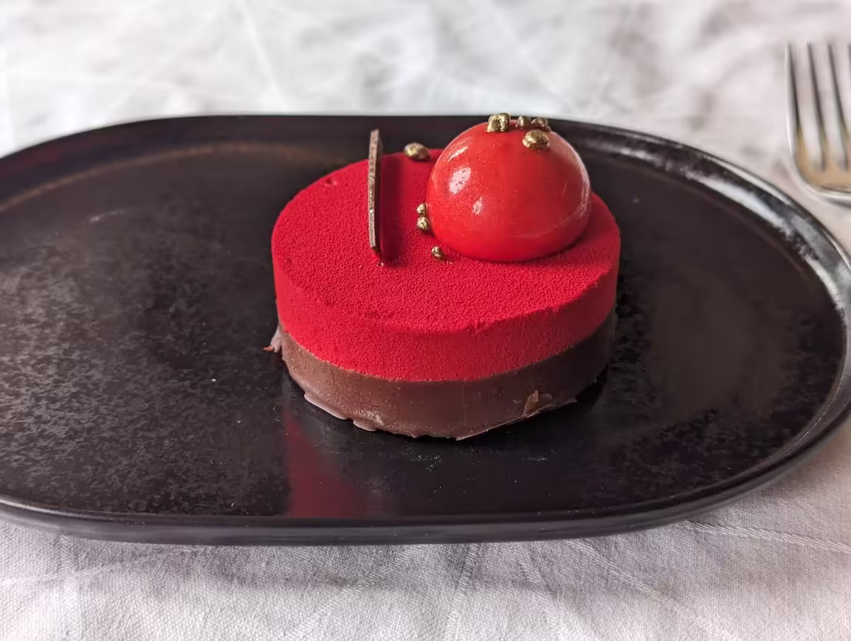 Finally, for dessert, I chose what I believe is a chocolate raspberry tart. I usually prefer to leave more space between pictures, but this is worth including. It was almost as good as it looks.