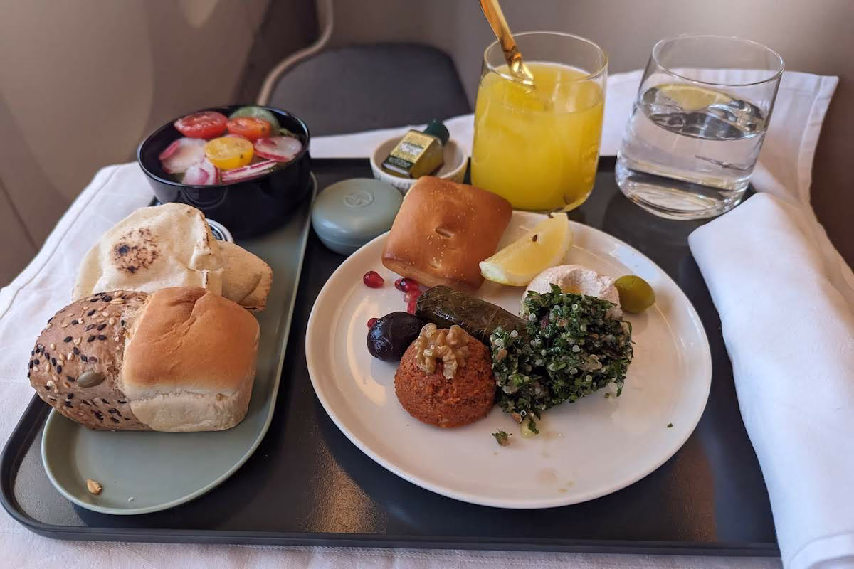 Our 13 hour and 45 minute flight is underway not long after. Once the seatbelt sign is off, the multi-course meal service begins. I chose the Arabic mezze as my starter, which is the featured image you can see at the top of this post. It comes with bread and a salad, and all of it is tasty.