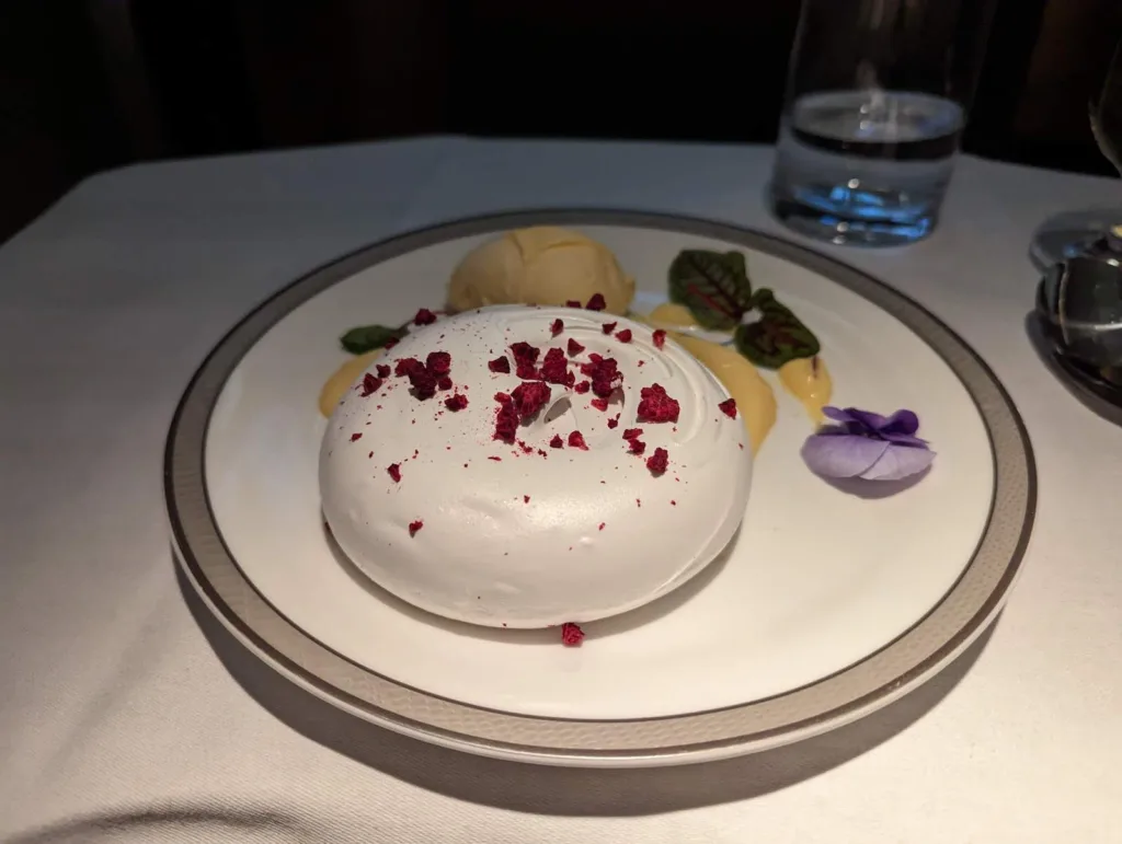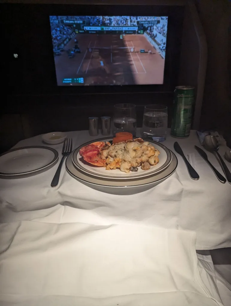 For the second meal, I preordered the Lobster Thermidor, a dish Singapore Airlines is apparently famous for. I take a couple bites of it sitting awkwardly in bed and it seems nice. Unfortunately, I quickly realise I actually don’t have much of an appetite and feel a bit unwell.