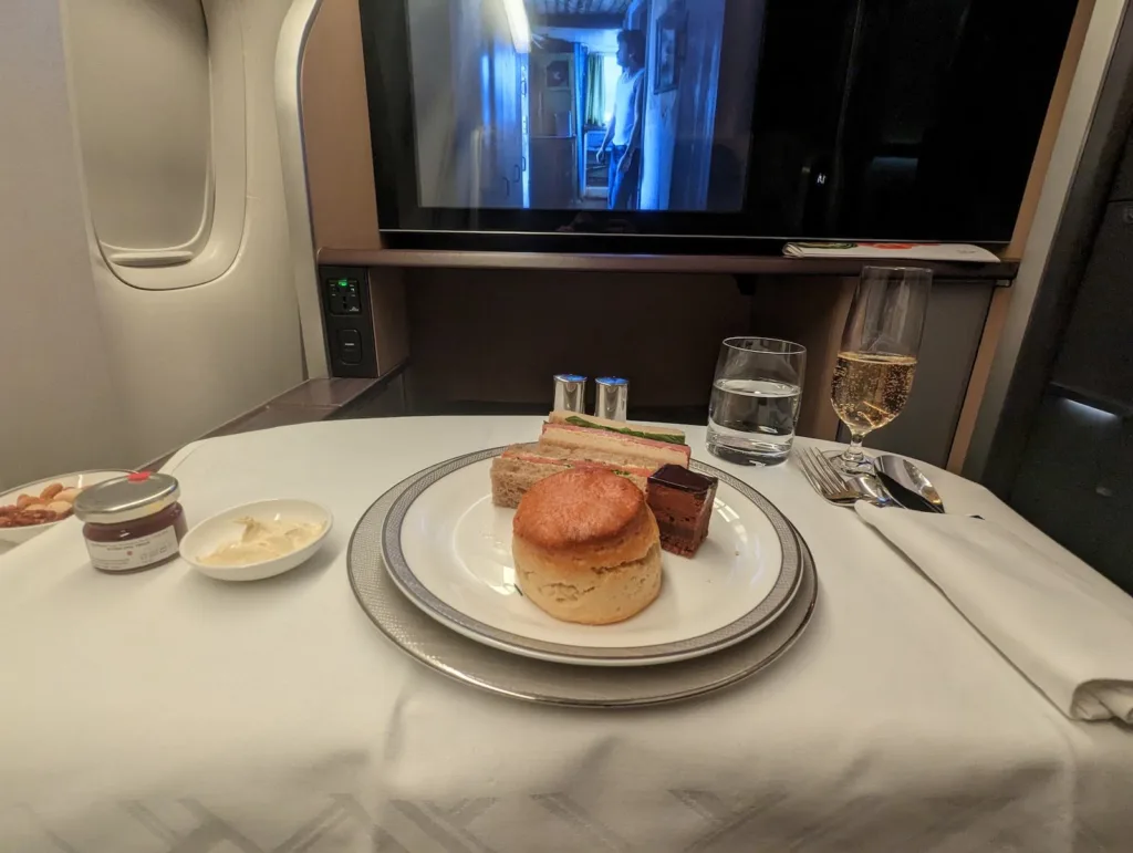 There are two meal services on this particular flight. The first is pretty light, likely due it being morning and since breakfast is available in the lounge. I end up with a kind of afternoon tea including finger sandwiches and a scone which are tasty.
