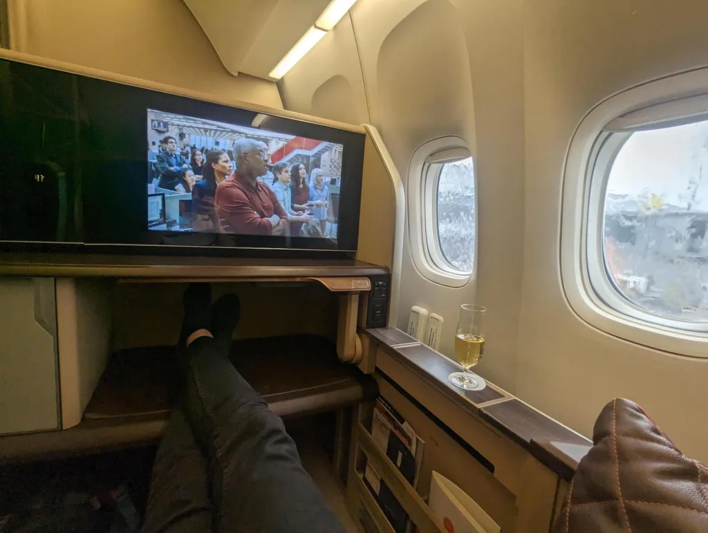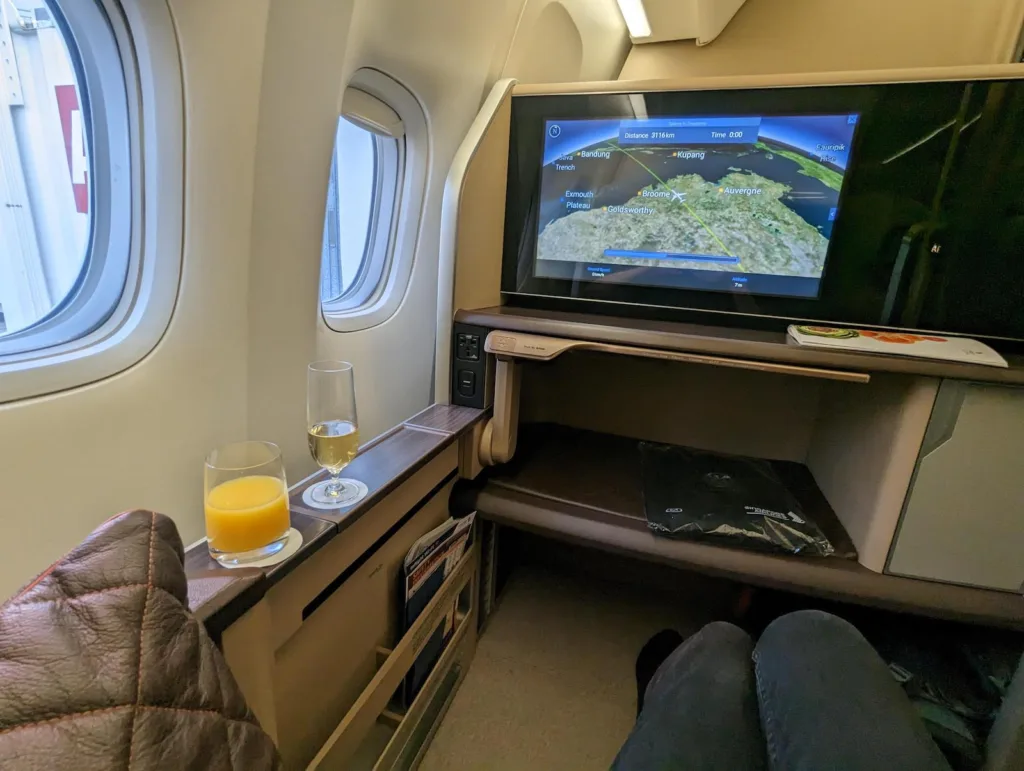 We’ll now skip to an hour or two later when I’m finally on board. The seat on this flight isn’t quite as good as on Singapore Airline’s Airbus A380. On those planes, everyone has a sliding door for privacy as well a separate bed to rest in.